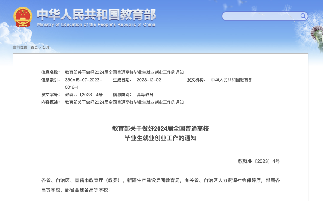 《关于做好2024届全国普通高校毕业生就业创业工作的通知》