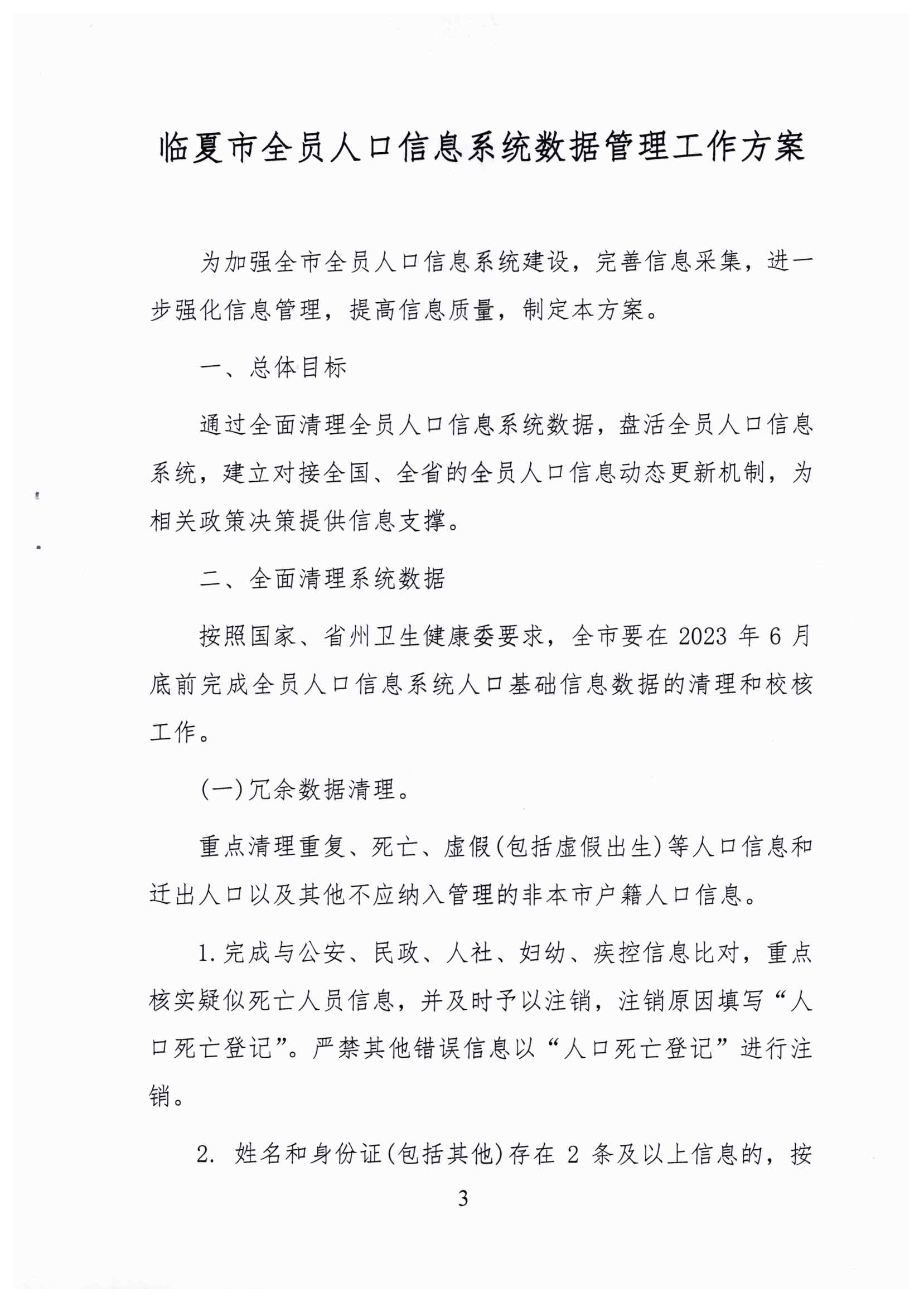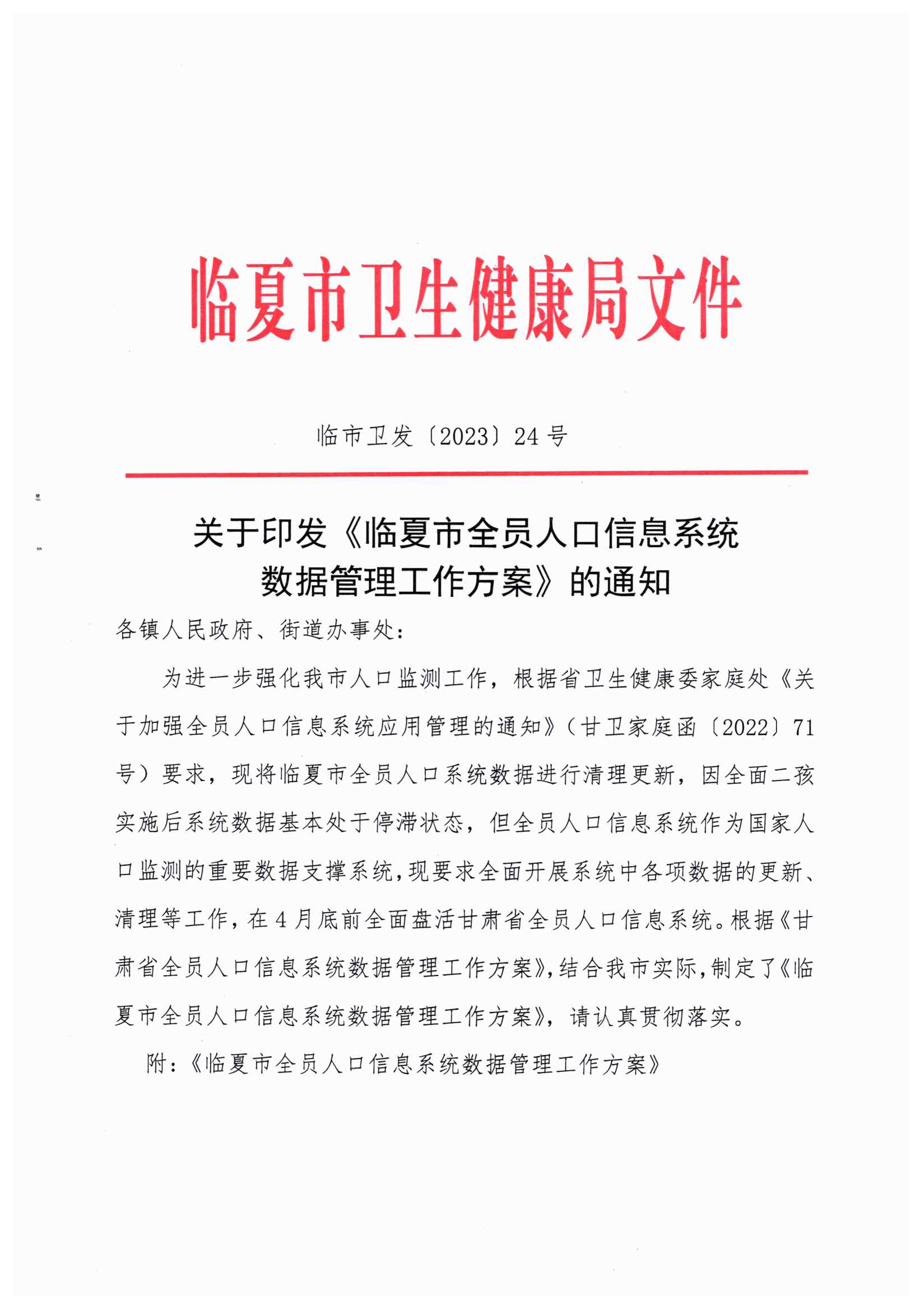 关于印发《临夏市全员人口信息系统数据管理工作方案》的通知