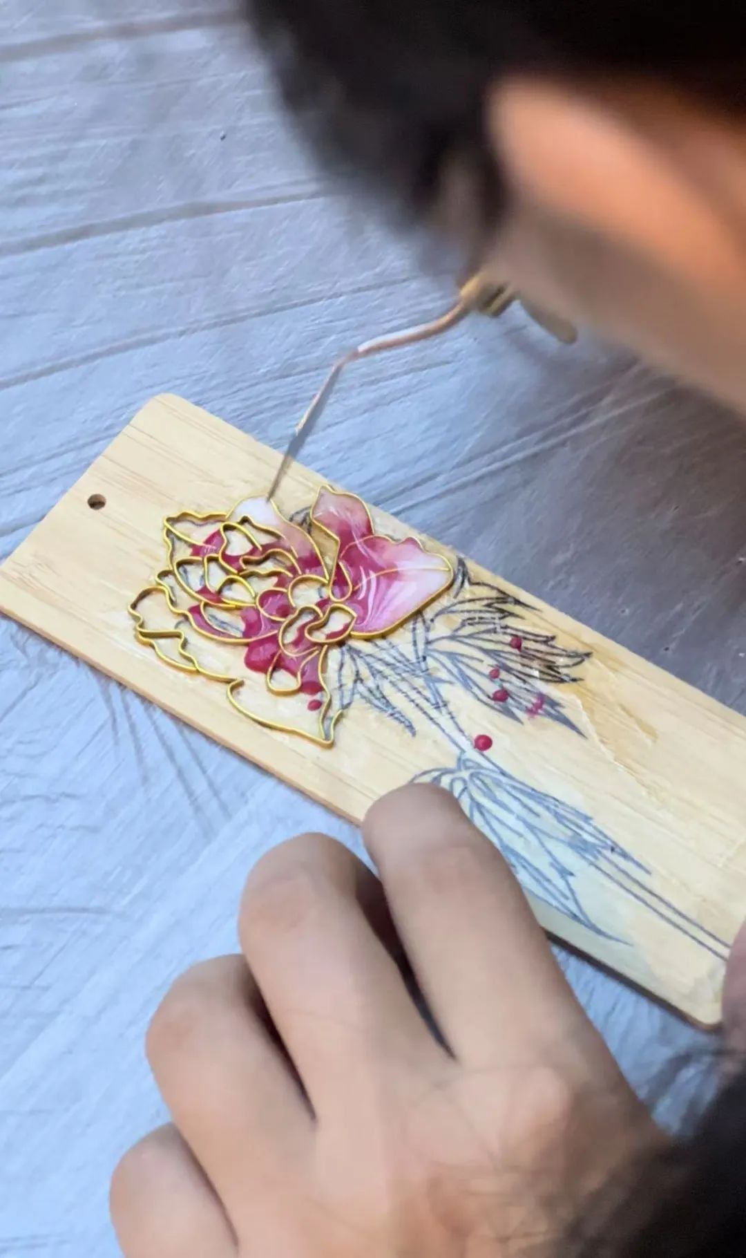 课上,非遗大师先是展示了几件传世的掐丝珐琅珍品,那些用金丝勾勒出的繁复花纹,在釉料的映衬下宛如凝固的彩虹。学员们围坐在一起,小心翼翼地将金丝掰弯、掐制成各种图案。