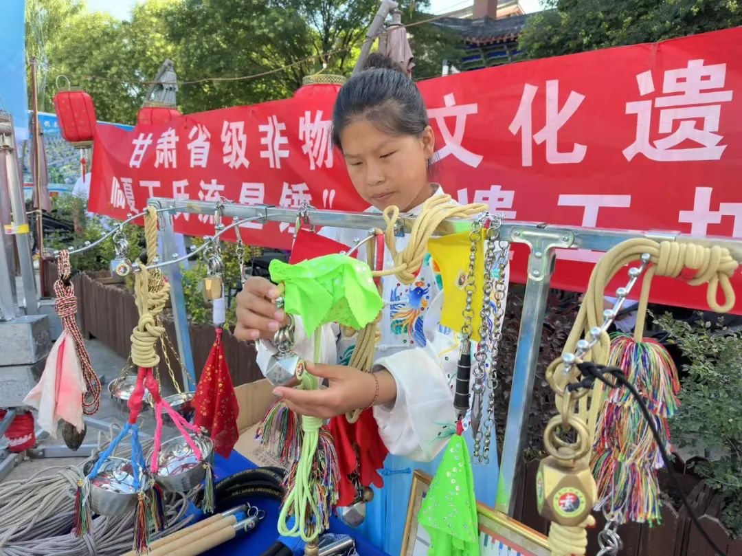 丁氏流星锤在传承人丁永喜及其弟子的演绎下惊艳亮相。这件源于临夏市南龙商川村丁战彪(又名丁王保柱)之手的软兵器,构造极具匠心:锤身呈独特菱形,拥有14个平面、24个棱尖与28个棱,顶端象鼻孔串联六个铁环;软索可在一丈二尺至一丈六尺间调整,重量在1000克至1500克之间,飞舞时缀饰的彩绸更添迷幻色彩。展演中,丁氏流星锤团队连贯呈现了丁氏绳镖、阴阳八卦锤、北斗七星锤等六大套路,以行云流水的舞花衔接技法,将“缠、绕、点、镖”的要诀展现得淋漓尽致,以其刚柔并济的神韵荣膺大会“最佳表演奖”,这不仅是民间智慧的生动体现,更是非遗薪火相传的生动见证。