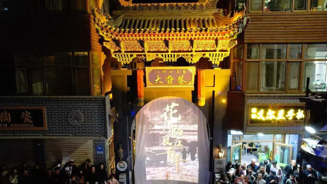 在精心设计的灯光映照下,古老的街巷焕发出梦幻般的光彩。石板路上投射着牡丹花纹,斑驳的墙面上跃动着历史剪影,每一处细节都在演绎着临夏的千年风华。这场演出不是简单的舞台表演,而是一次穿越时空的文化之旅。