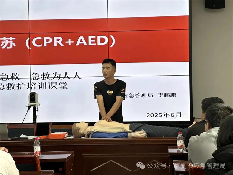 心肺复苏 + AED 操作应急救护培训更是此次培训的亮点。临夏市红十字会讲师、法规股李鹏鹏同志详细讲解了心搏骤停和生命链、心肺复苏、自动体外除颤器使用、气道异物梗阻的现场处置等内容,并借助模拟人进行现场实操演示。学员们积极参与互动,在讲师的指导下,亲身体验心肺复苏和AED的操作步骤,确保每位学员都能熟练掌握这两项关键的急救技能。