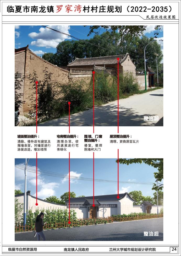 立面整治:对墙体进行清洗和粉刷,对沿路民居的墙体按照乡村民居风貌区确定的色彩进行装饰,对墙体彩绘采用马家窑彩陶文化,展现农耕文化的农具应具有地方特色。对于外露的雨水管及电线等进行整治和隐藏处理,保持立面干净整洁。