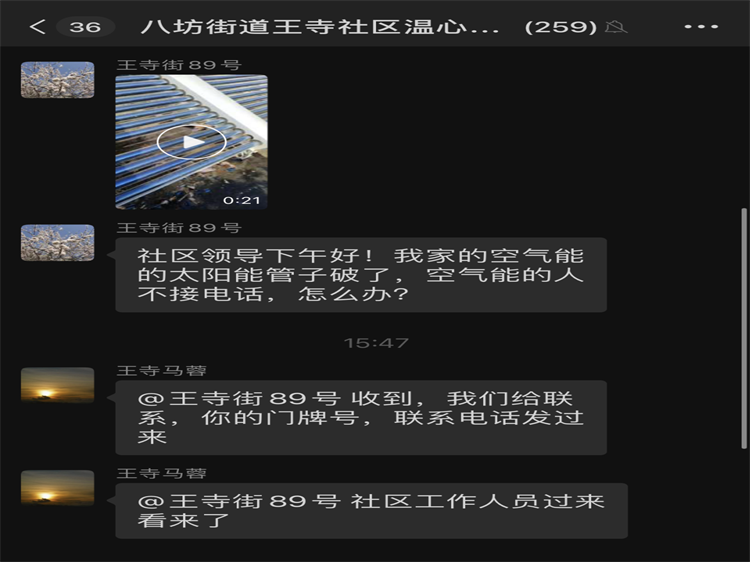 群众事,无小事。八坊街道王寺社区积极将群众烦心事、关心事都放在心上,及时回应群众关切的问题,做好群众“暖心人”,近日,家住王寺街的居民在微信群中向社区工作人员求助,家中空气能设备漏水故障,希望社区帮忙协调解决。