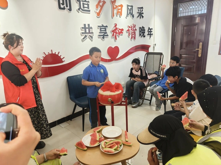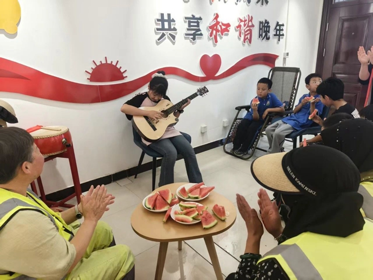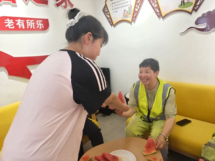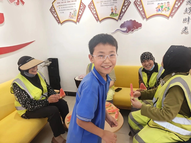 活动当天,孩子们早早来到暖心驿站,将提前准备好的西瓜、矿泉水整齐摆放。当看到清洁阿姨们结束上午的工作走进驿站时,孩子们立刻围上前,纷纷递上清凉的饮品和切好的西瓜,一声声“阿姨您辛苦了”“请吃西瓜”,让阿姨们脸上露出了欣慰的笑容。随后,孩子们还精心准备了才艺表演。稚嫩的歌声、活泼的舞蹈、充满童趣的诗朗诵……一个个精彩的节目接连上演,驿站内不时响起阵阵掌声。清洁阿姨们坐在一旁,一边品尝着清甜的西瓜,一边看着孩子们认真的表演,眼角的疲惫被笑容取代,整个驿站充满了欢声笑语。“孩子们太懂事了,收到他们送的西瓜和水,心里比吃了蜜还甜。”一位清洁阿姨感动地说。参与活动的孩子们也表示,看到阿姨们开心的样子,自己也特别快乐。