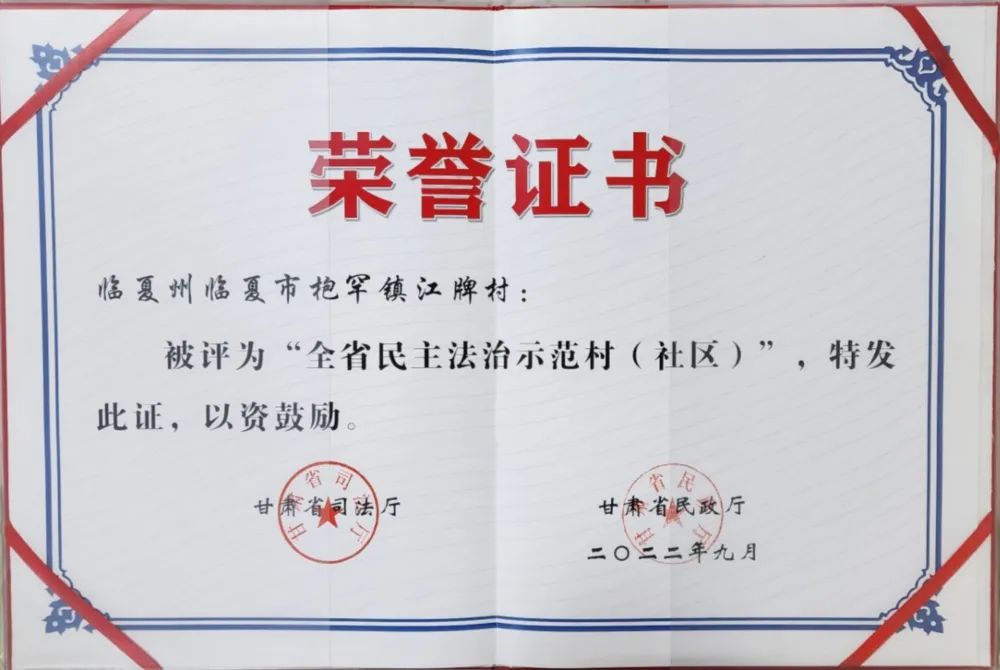 近日,枹罕镇江牌村被甘肃省司法厅、甘肃省民政厅授予“全省民主法治示范村(社区)”荣誉称号。