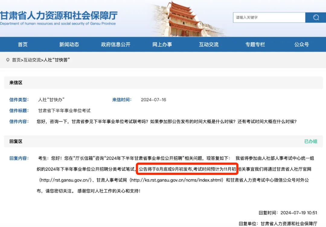我省将参加由人社部人事考试中心统一组织的2024年下半年事业单位公开招聘分类考试笔试,公告将于8月底或9月初发布,考试时间预计为11月初,相关事宜我们将通过甘肃省人社厅官网(http://rst.gansu.gov.cn/)、甘肃人事考试网(http://ks.rst.gansu.gov.cn/ncms/index.shtml)和甘肃省人力资考试中心微信公众号对外公布,请您密切关注。感谢您对人社工作的关心和支持!