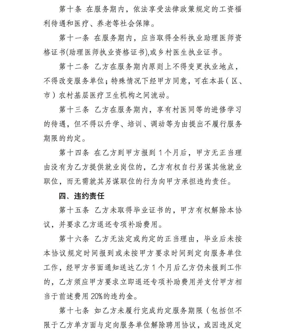(三)未按约定履行完6年服务年限的,按每少服务1年(不足1年按1年计算)支付0.5万元,一次性退还享受的补助,并支付前述费用20%的违约金,其违约事实由省级卫生健康行政部门记入个人诚信档案并向社会公布,同时承担就业协议约定的其他违约责任。