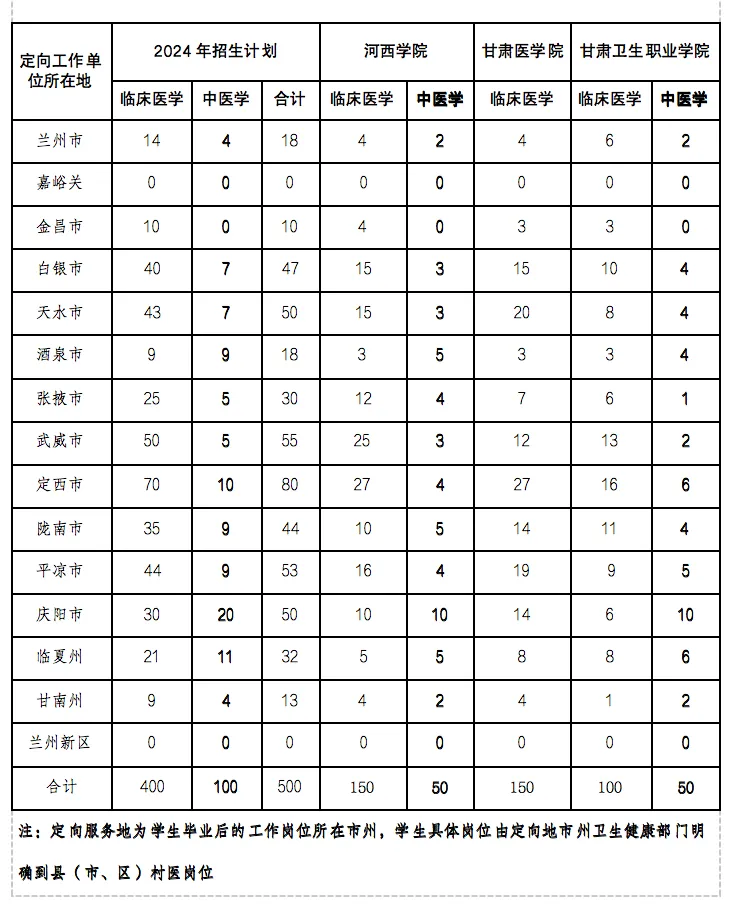 1.2024年甘肃省村医定向医学生分培养院校和定向服务地招生计划