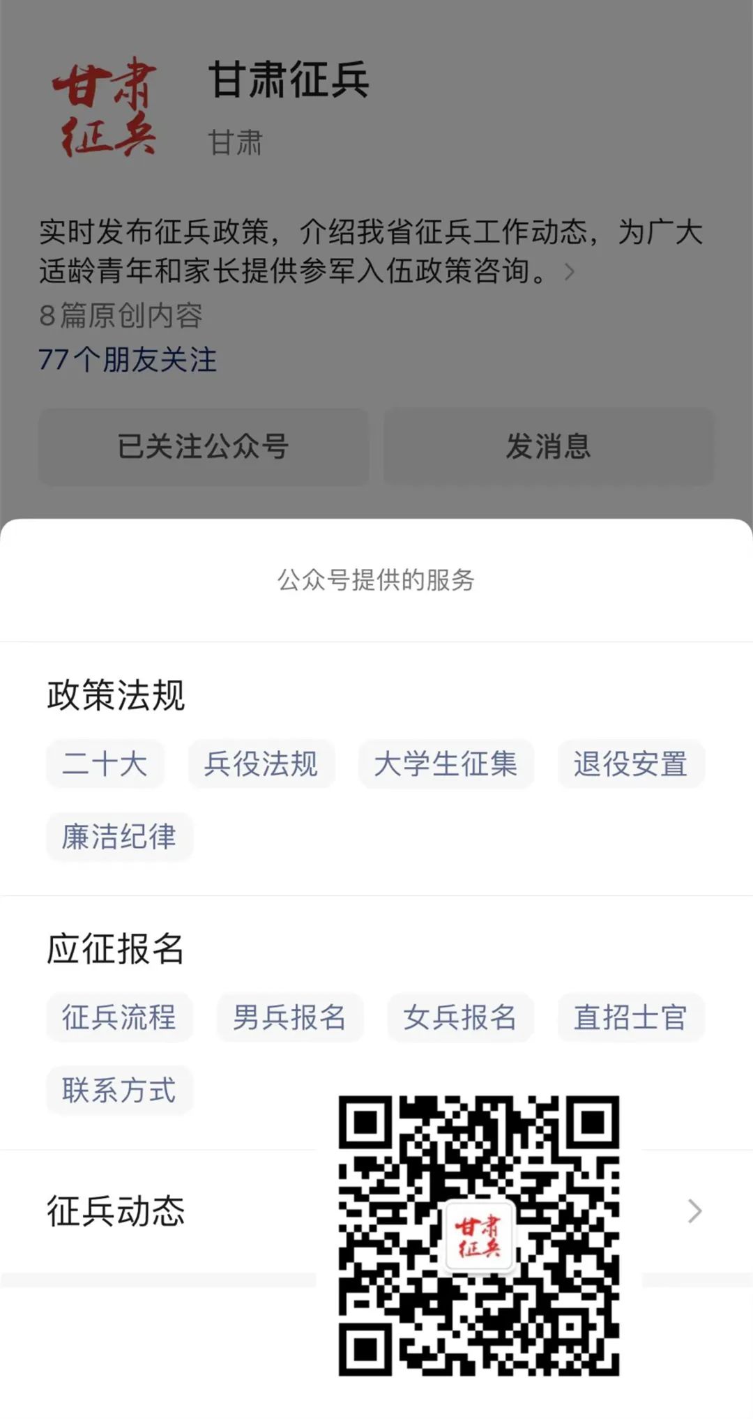 也可关注“甘肃征兵”,通过子菜单栏目“应征报名”→“男兵报名”“女兵报名”进行应征报名。