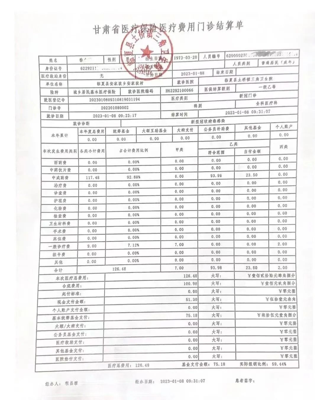 临夏州于2023年1月8日9:31分,临夏县参保居民徐某某在临夏县土桥镇三角卫生院直接结算新冠门诊医疗费用126.48元,医保政策范围内报销75.18元,此为临夏州首例享受基本医保新冠门诊报销的参保人员,标志着新冠感染治疗费用“乙类乙管”门诊政策在我州落地实施。