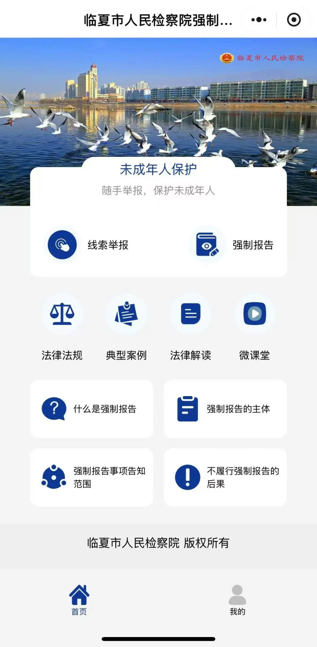 为保障未成年人合法权益,临夏市人民检察院开通了保护未成年人专属平台一一“临夏市强制报告制度微信小程序”,通过数字化手段促进能动履职,强化检察机关综合履职效能,构建未成年人保护和法律监督新平台。