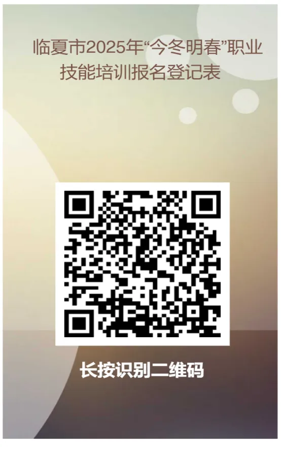 为切实满足全市广大劳动者对职业技能培训的个性化需求,进一步增强培训服务能力,提升就业培训针对性和实效性,结合我市工作实际,临夏市人社局将委托专业职业技能培训机构开展各类培训,现面向我市符合条件的劳动者公开征集职业技能培训报名意愿。一、培训对象根据有关规定,培训对象为:1.农村转移就业劳动者;2.防止返贫监测对象;3.毕业年度高校毕业生(含技工院校高级工班、预备技师班、技师班和特殊教育院校职业教育类毕业生);4.城乡未继续升学的应届初高中毕业生;5.城镇登记失业人员;6.经认定的就业困难人员。参加培训人员需无就业单位、未参加职工社会保险、名下无营业执照、一二级重度残疾人不得参训,男18-60周岁,女18-55周岁。二、培训形式及地点以线下实操技能培训为主,具体地点以培训机构通知为准,每一工种待满额后即通知开班。三、培训报名报名方式:1.长按识别下方二维码线上填报;