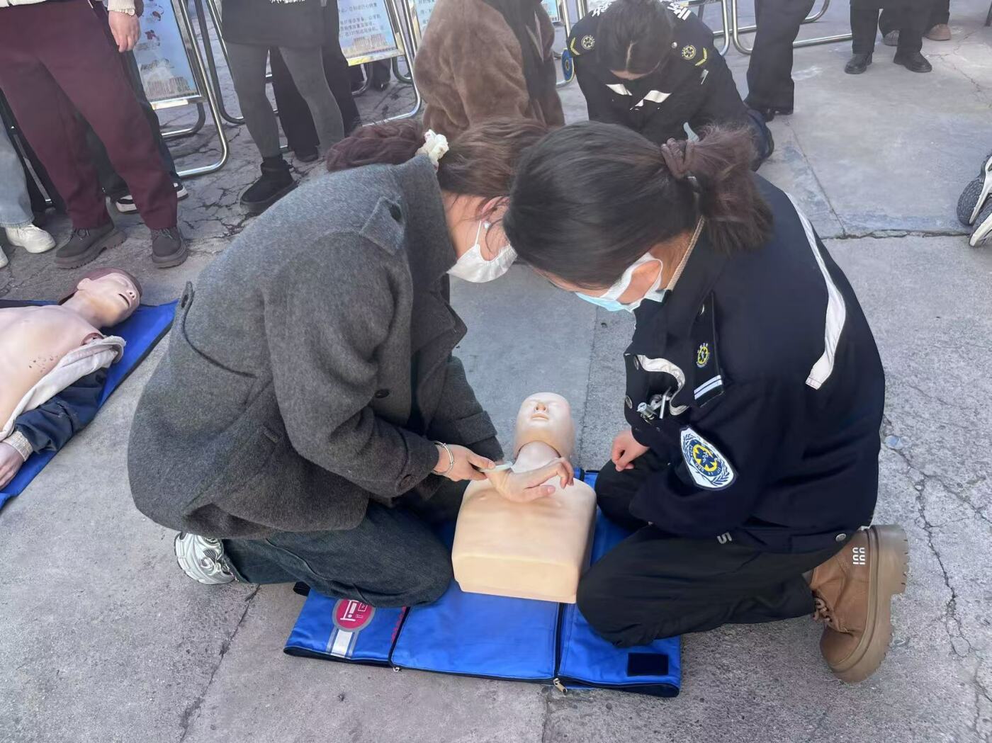 在理论知识讲解环节,讲师详细介绍了心肺复苏(CPR)、海姆立克急救法等常见急救技能的原理和操作要点,并通过展示各类急救内容展板和细致入微的讲解,让复杂的医学知识变得通俗易懂。