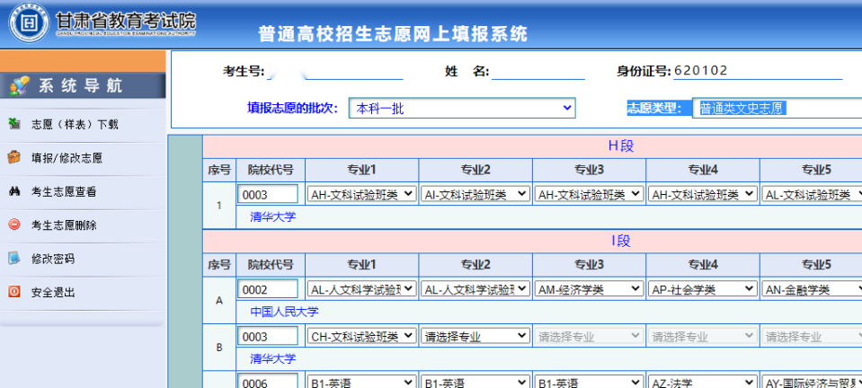 7.志愿提交后,如考生要修改某批次志愿,点击“系统导航”栏中的“填报/修改志愿”选项,选择批次后,使用“志愿提交密码”修改志愿。