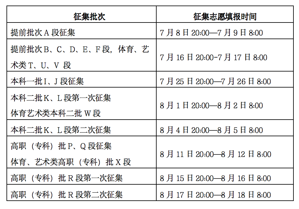 二、网上征集志愿的批次及时间1.征集志愿的批次除本科提前批次(G段)、本科一批(H段)、高职(专科)批(S段)三个批次中的3个段不实行征集志愿外,其他批次其他段均实施征集志愿。2.征集志愿的时间