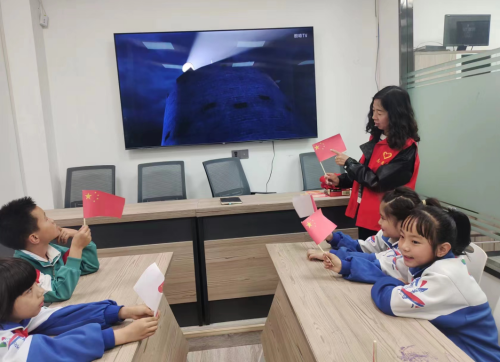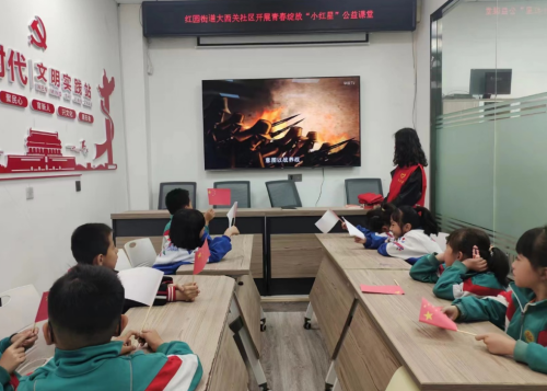 课堂中,志愿者老师耐心讲解了制作小红旗的方法,大家通过老师的指导制作出了一面面鲜红的小旗帜,小朋友们挥舞着制作好的小红旗,大声唱着红色歌曲。回声嘹亮,誓言铮铮。孩子们激情澎湃,气氛热烈,红色种子已在小朋友心中悄然播撒。