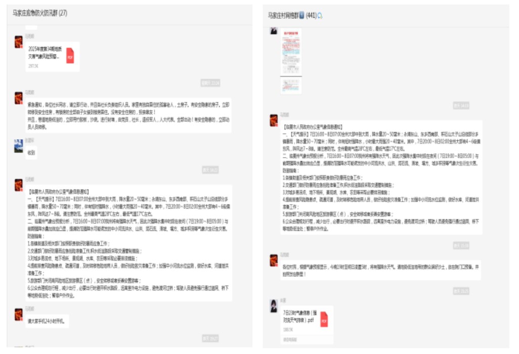 工作人员通过“线上+线下”相结合的方式,宣传引导,增强群众的防汛意识,提高群众自救互救能力。线上,利用微信群,及时发布暴雨预警信息、防汛知识和自救指南等内容;线下,组织开展防汛知识宣传,为群众讲解暴雨洪涝灾害的防范措施和应对方法。提醒群众应密切关注天气预报,遇暴雨、雷电等强对流天气时,尽量减少外出,避免前往低洼地带、河道周边等危险区域。同时对各社重点点位进行地毯式排查,查看路段易堵易涝点等,并对发现的隐患及时进行标识,做到有问题早发现、早解决,确保风险隐患点人员安全。
